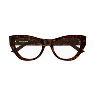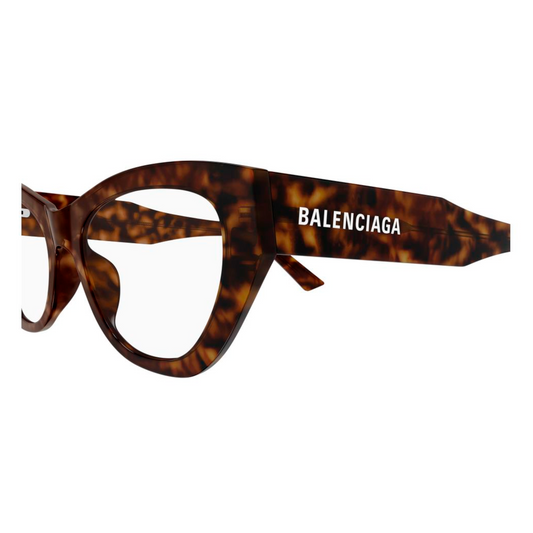 "Flaches Konzept in Voll-HD-Konstruktion mit schmalen Profilen, die Tragekomfort und Leichtigkeit garantieren. Feminine Cat-Eye-Korrekturbrille. Balenciaga Schriftzug-Logo auf den Bügeln."